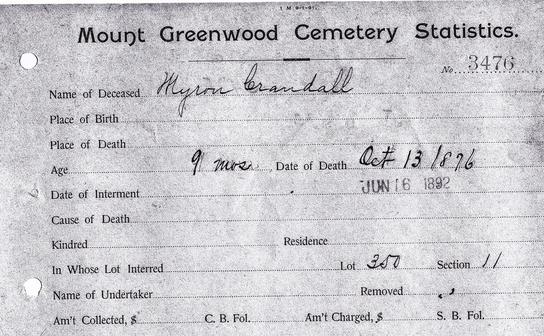 The members of the Crandall family listed here were originally buried in Bachelors Grove but were reinterred at Mt. Greenwood Cemetery, Chicago, Il on June 6, 1892. Re interrment burial records at Mt. Greenwood show that in addition to those listed in the Bachelors Grove Where the Trails Cross, two other Crandall children were removed from Bachelors Grove Cemetery . (burial documents below, all with same interrment dates)